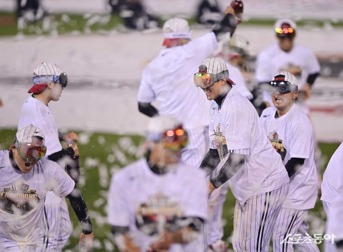 13일 서울 잠실야구장에서 열린 ‘2023 KBO 포스트시즌’ KT 위즈와 LG 트윈스의 한국시리즈 5차전 경기에서 6-2로 승리하며 통합 우승을 차지한 LG 홍창기가 샴페인 샤워를 하고 있다.