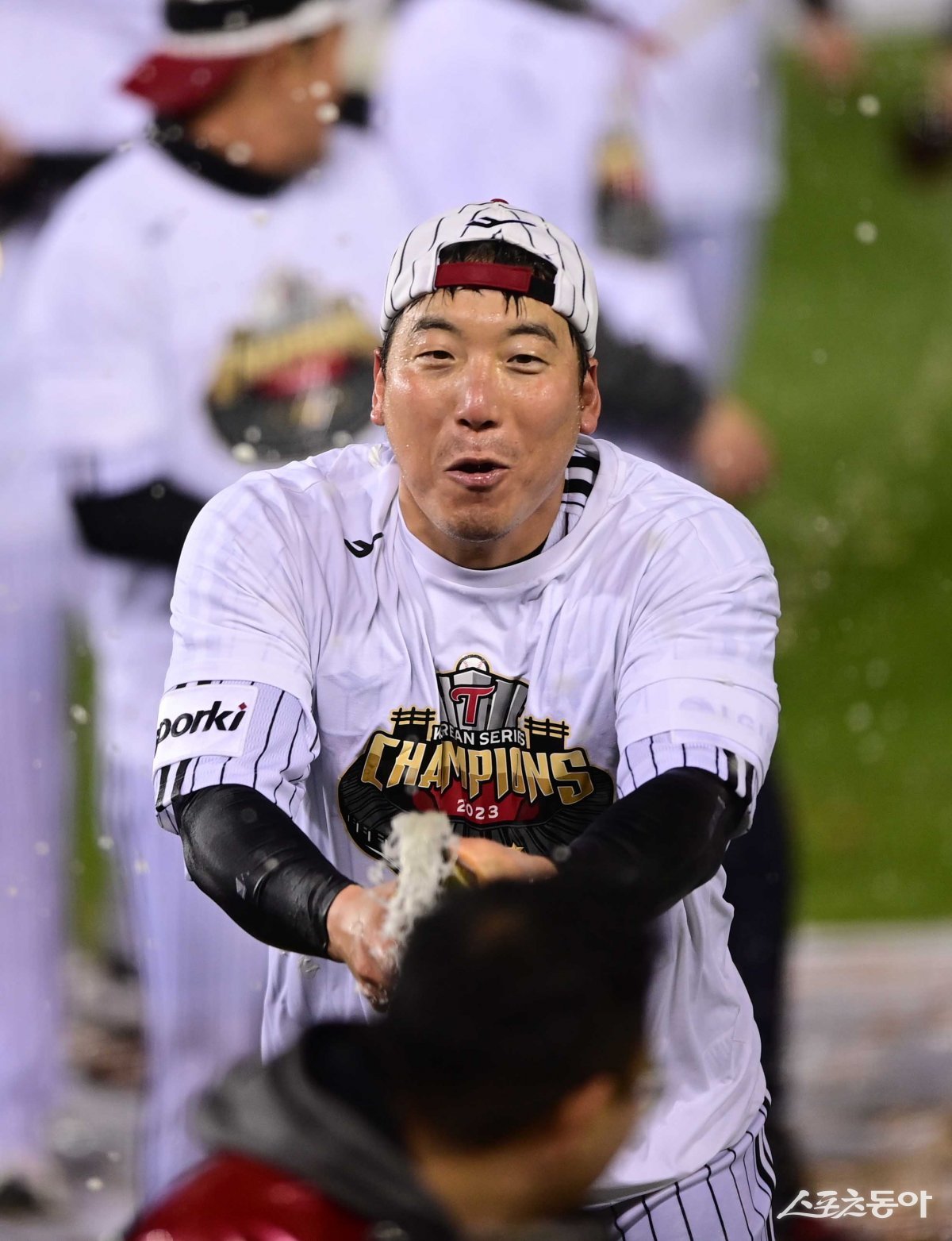 13일 서울 잠실야구장에서 열린 ‘2023 KBO 포스트시즌’ KT 위즈와 LG 트윈스의 한국시리즈 5차전 경기에서 6-2로 승리하며 통합 우승을 차지한 LG 김현수가 동료와 샴페인 샤워를 하고 있다. 잠실 | 주현희 기자 teth1147@donga.com