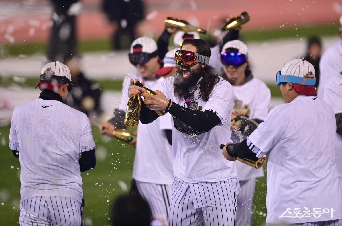 13일 서울 잠실야구장에서 열린 ‘2023 KBO 포스트시즌’ KT 위즈와 LG 트윈스의 한국시리즈 5차전 경기에서 6-2로 승리하며 통합 우승을 차지한 LG 켈리가 도료들과 샴페인 샤워를 하고 있다.