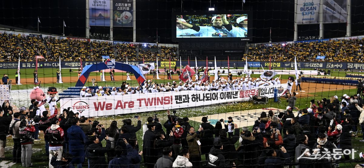 13일 서울 잠실야구장에서 ‘2023 신한은행 SOL KBO리그’ LG 트윈스와 kt 위즤의 한국시리즈 5차전 경기가 열렸다. LG가 kt를 꺾고 29년 만의 한국시리즈 우승을 차지한 후 선수들이 팬들에게 인사하고 있다. 잠실 | 김민성 기자 marineboy@donga.com
