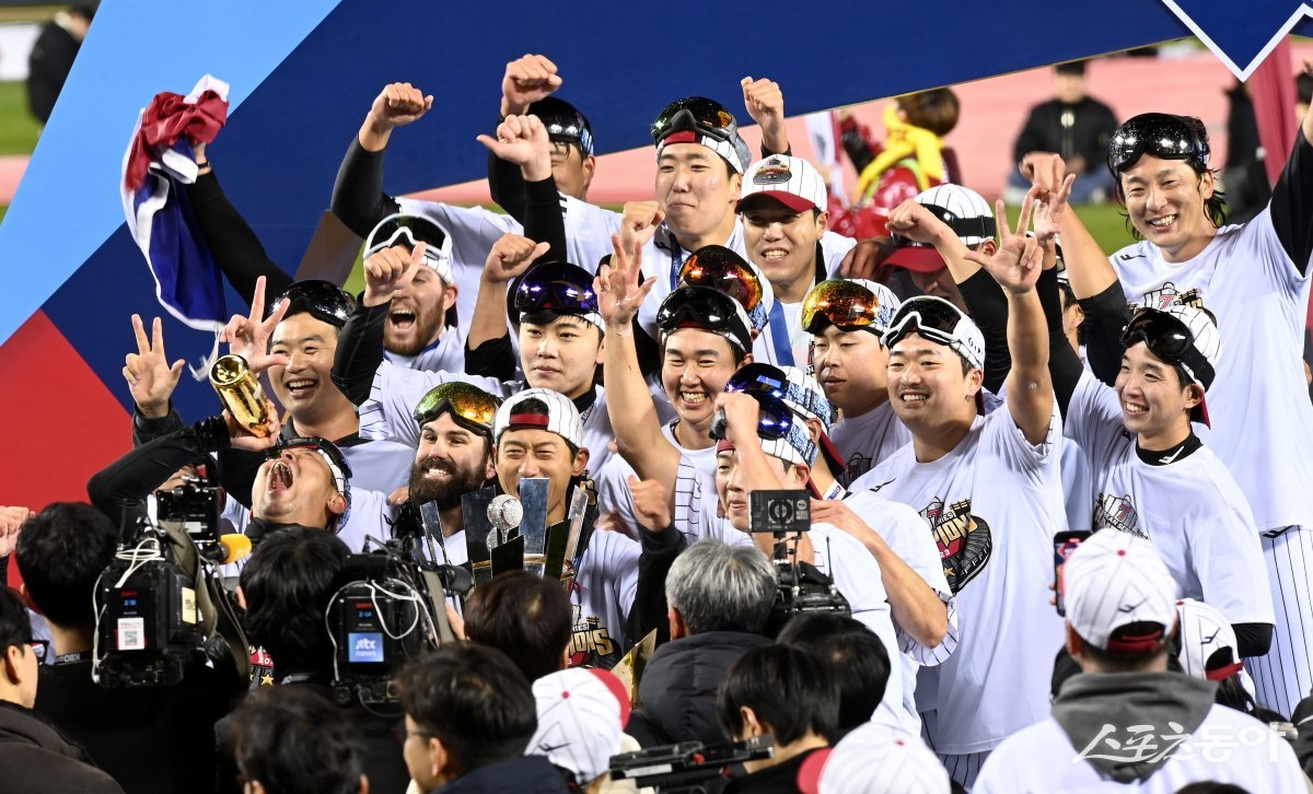 13일 서울 잠실야구장에서 ‘2023 신한은행 SOL KBO리그’ LG 트윈스와 kt 위즤의 한국시리즈 5차전 경기가 열렸다. LG가 kt를 꺾고 29년 만의 한국시리즈 우승을 차지한 후 선수들이 기념촬영을 하고 있다.