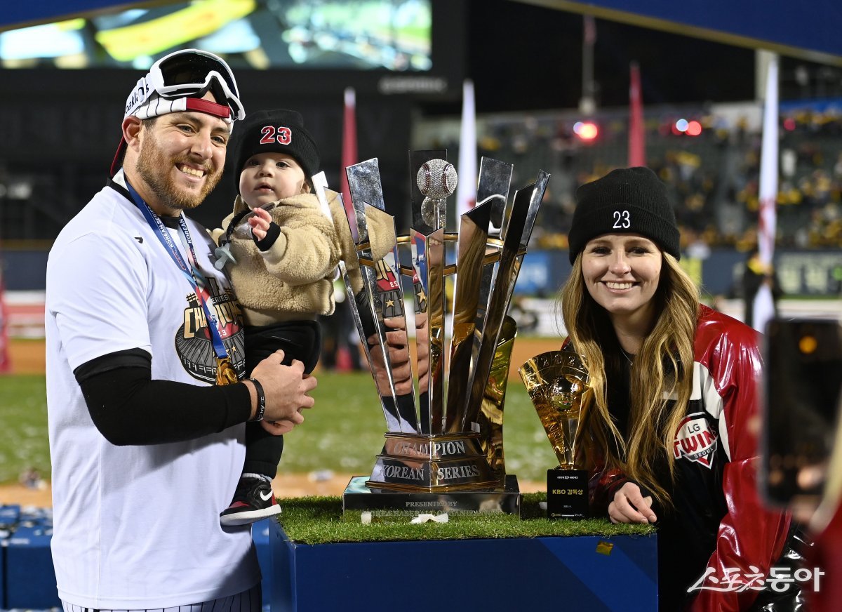 13일 서울 잠실야구장에서 ‘2023 신한은행 SOL KBO리그’ 포스트시즌 한국시리즈 5차전 KT 위즈와 LG 트윈스 경기가 열렸다. LG가 6-2 승리를 거두며 한국시리즈 전적 4승 1패로 우승을 확정지었다. LG 오스틴이 가족과 기념촬영을 하고 있다.