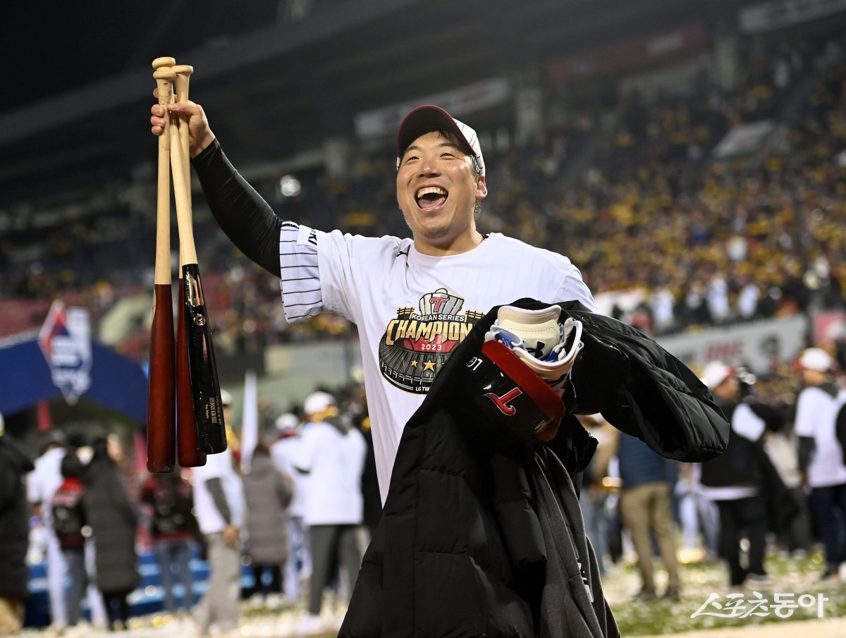 13일 서울 잠실야구장에서 ‘2023 신한은행 SOL KBO리그’ 포스트시즌 한국시리즈 5차전 KT 위즈와 LG 트윈스 경기가 열렸다. LG가 6-2 승리를 거두며 한국시리즈 전적 4승 1패로 우승을 확정지었다. LG 김현수가 팬들에게 인사하고 있다.