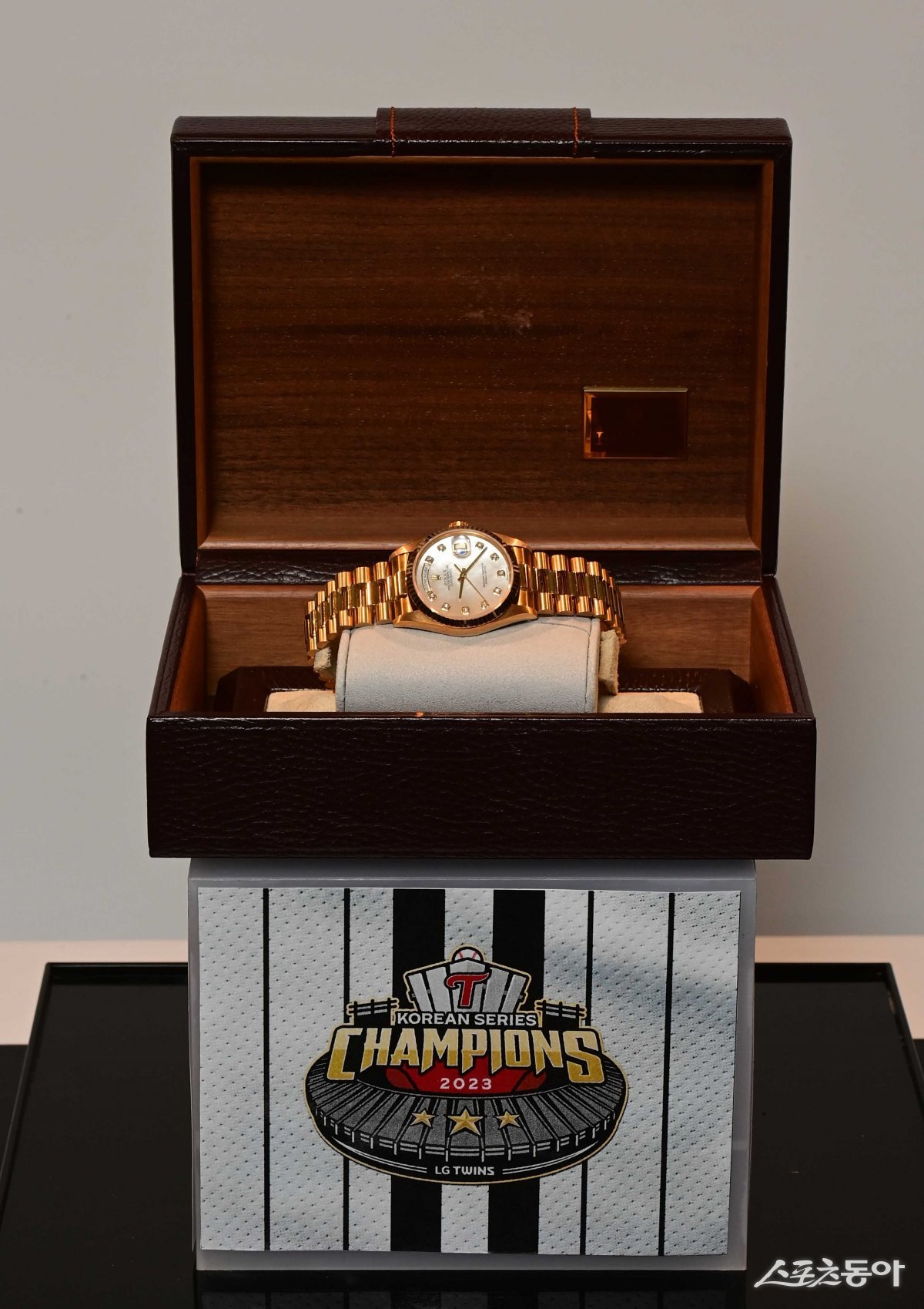 13일 서울 잠실야구장에서 열린 ‘2023 KBO 포스트시즌’ KT 위즈와 LG 트윈스의 한국시리즈 5차전 경기에서 6-2로 승리하며 통합 우승을 차지한 후 세 번째 우승을 기원하며 구입했던 롤렉스 시계가 공개됐다. 잠실 | 주현희 기자 teth1147@donga.com
