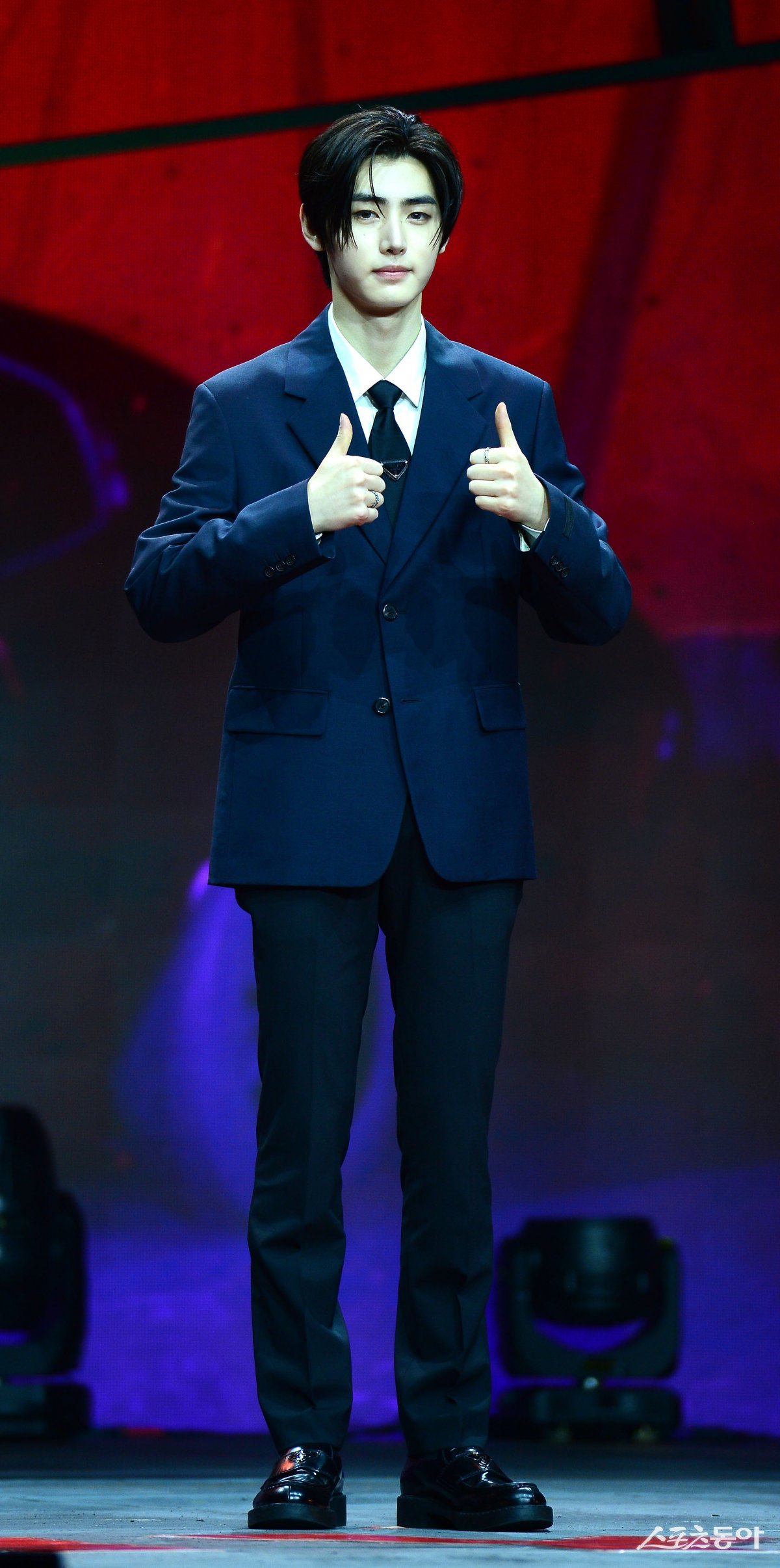 그룹 엔하이픈(ENHYPEN) 성훈이 16일 서울 광진구 예스24 라이브홀에서 열린 미니 5집 ‘ORANGE BLOOD’ 발매 쇼케이스에서 포토타임을 갖고 있다.