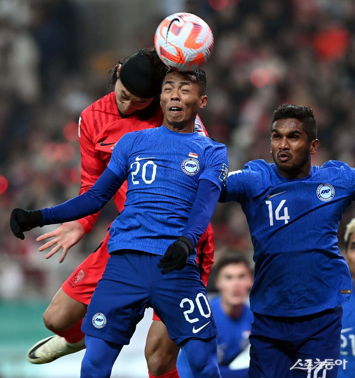 16일 서울 마포구 서울월드컵경기장에서 ‘2026 북중미 월드컵’ 아시아 2차예선 한국과 싱가포르의 경기에서 한국 조규성이 헤딩슛을 날리고 있다.
