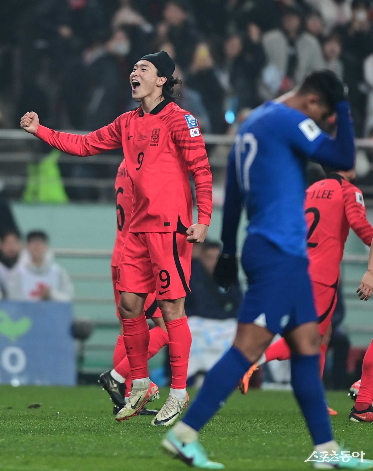 16일 서울월드컵경기장에서 열린 ‘2026 국제축구연맹(FIFA) 북중미 월드컵’ 아시아 지역 2차 예선에서 한국과 싱가포르의 경기에서 한국 조규성이 선취골을 성공시킨 후 세리머니를 하고 있다.