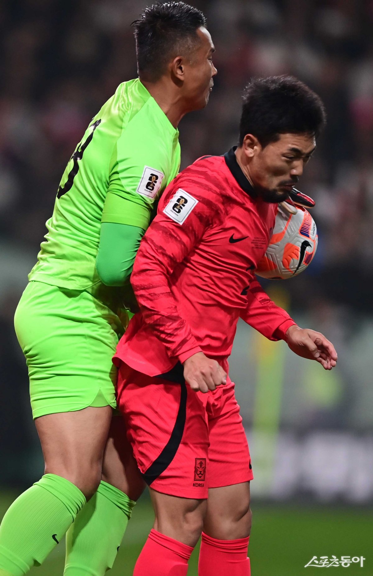16일 서울월드컵경기장에서 열린 ‘2026 국제축구연맹(FIFA) 북중미 월드컵’ 아시아 지역 2차 예선에서 한국과 싱가포르의 경기에서 한국 이기제가 싱가포르 골키퍼와 충돌하고 있다.