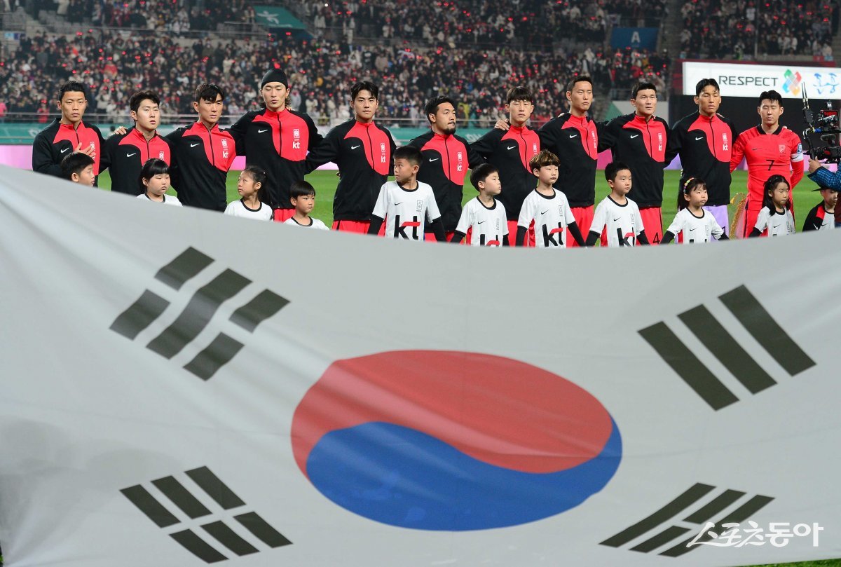 16일 서울월드컵경기장에서 열린 ‘2026 국제축구연맹(FIFA) 북중미 월드컵’ 아시아 지역 2차 예선에서 한국과 싱가포르의 경기에 앞서 한국 선수들이 애국가 제창을 하고 있다.