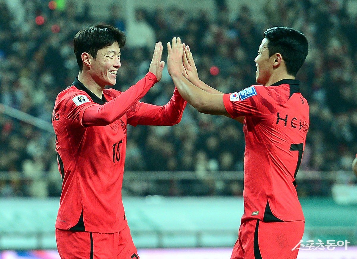16일 서울 마포구 서울월드컵경기장에서 ‘2026 북중미 월드컵’ 아시아 2차예선 한국과 싱가포르의 경기에서 한국 황의조가 페널티킥을 성공시킨 후 황희찬과 기쁨을 나누고 있다.