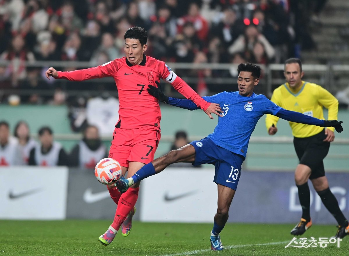 16일 서울월드컵경기장에서 열린 ‘2026 국제축구연맹(FIFA) 북중미 월드컵’ 아시아 지역 2차 예선에서 한국과 싱가포르의 경기에서 한국 손흥민이 싱가포르 수비를 뚫고 드리블 돌파를 하고 있다.