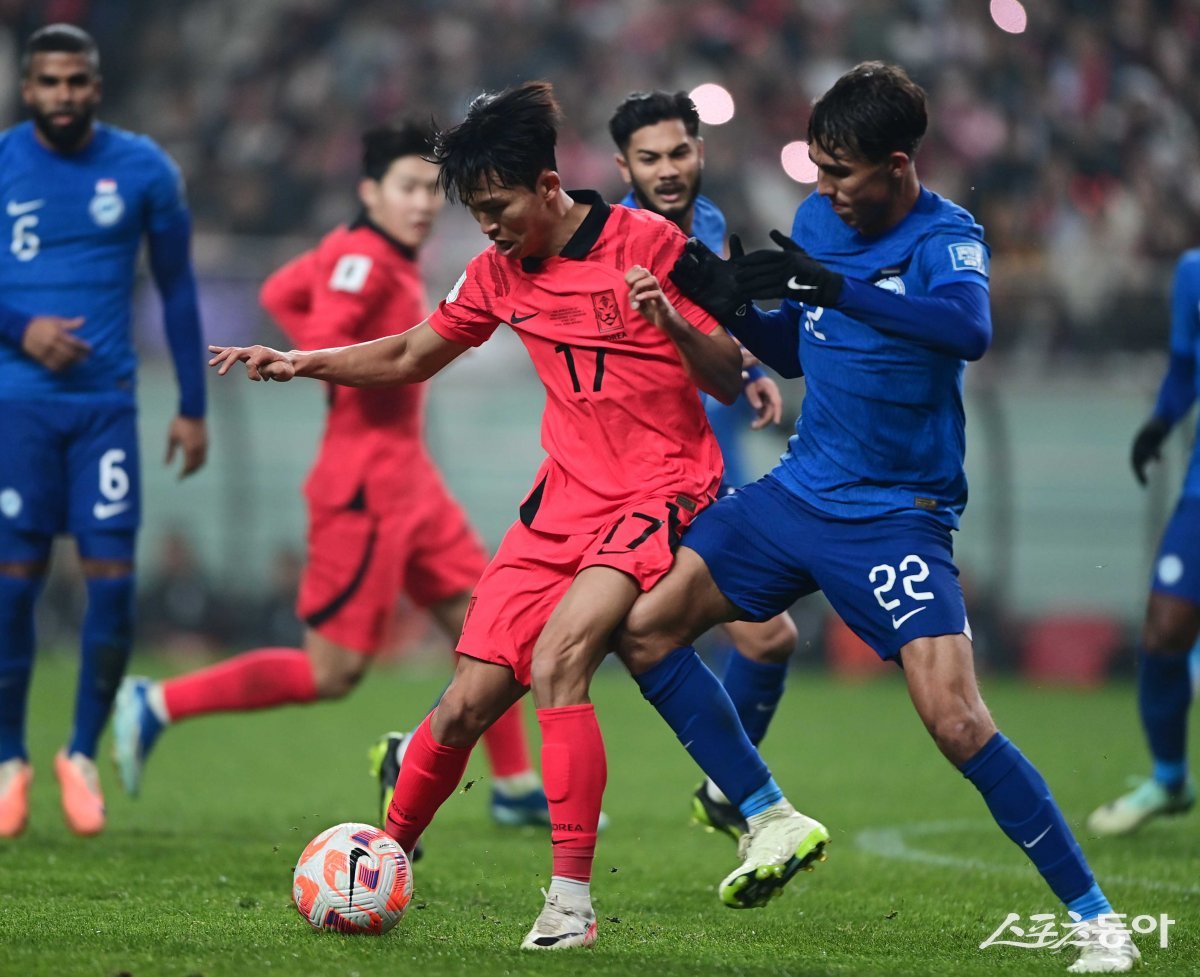 16일 서울월드컵경기장에서 열린 ‘2026 국제축구연맹(FIFA) 북중미 월드컵’ 아시아 지역 2차 예선에서 한국과 싱가포르의 경기에서 한국 정우영이 싱가포르 수비를 피해 패스를 하고 있다.