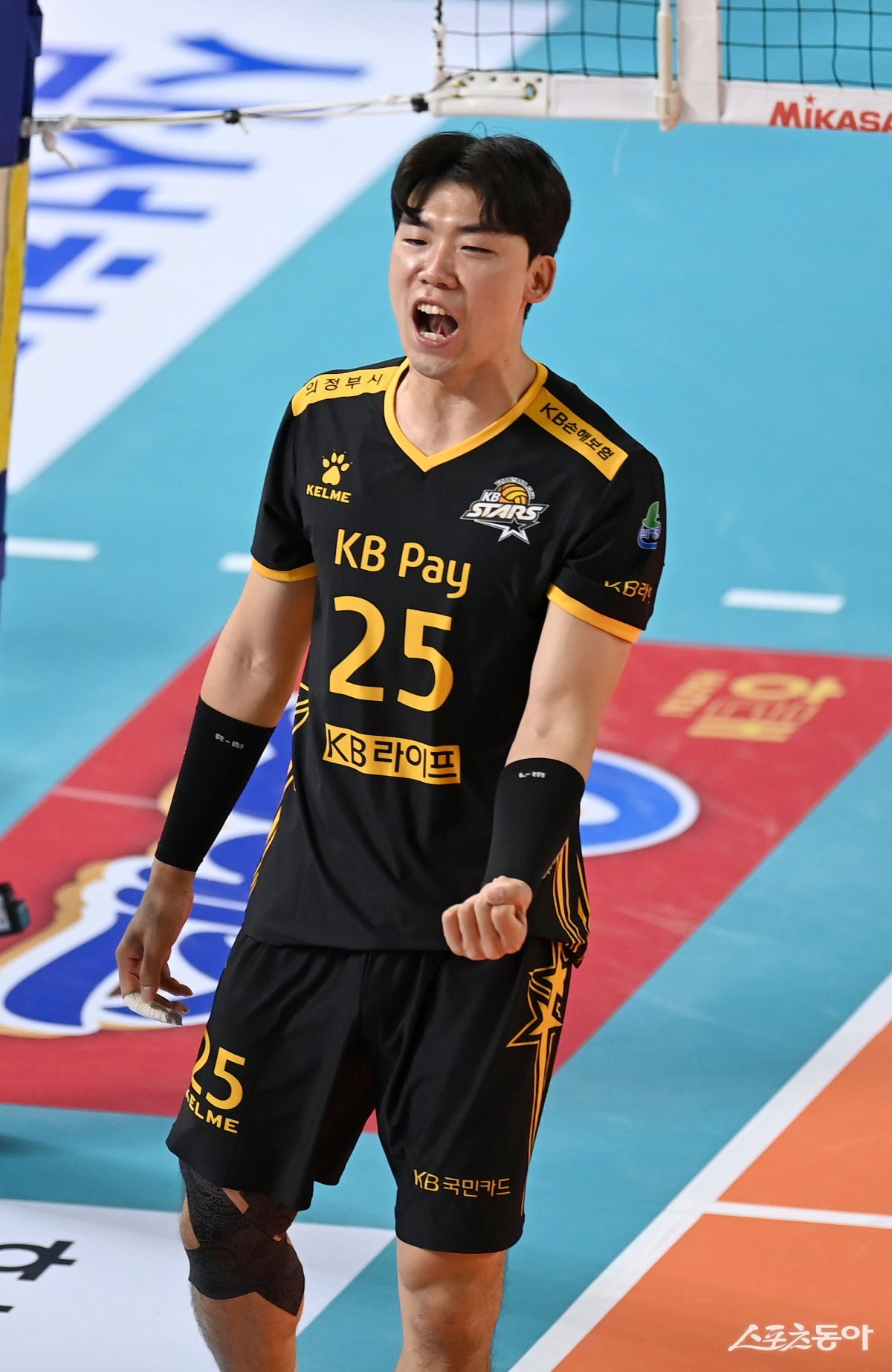 19일 대전충무체육관에서 열린 ‘도드람 2023~2024 V-리그’ 남자부 삼성화재와 KB손해보험 경기에서 KB손해보험 한국민이 블로킹 득점에 성공한 후 기뻐하고 있다.