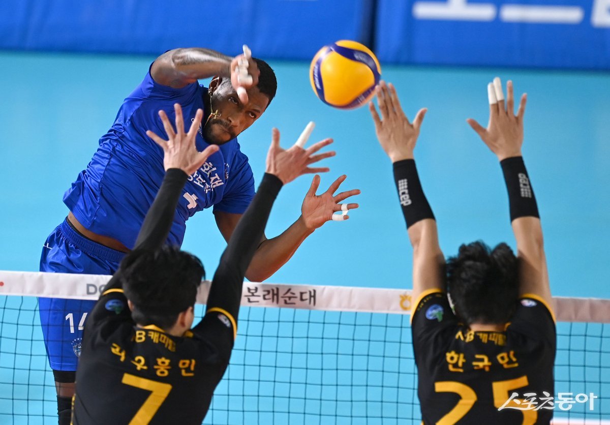19일 대전충무체육관에서 열린 ‘도드람 2023~2024 V-리그’ 남자부 삼성화재와 KB손해보험 경기에서 삼성화재 요스바니가 KB손해보험의 블로킹 사이로 스파이크를 날리고 있다.
