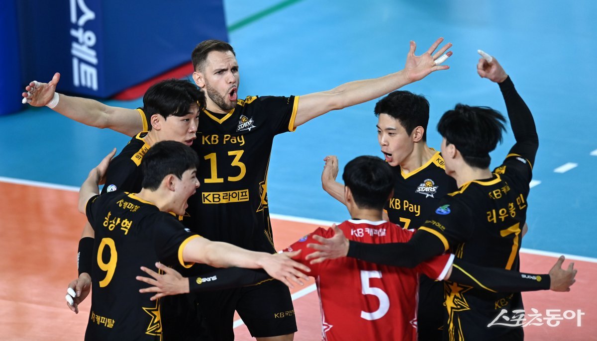 19일 대전충무체육관에서 열린 ‘도드람 2023~2024 V-리그’ 남자부 삼성화재와 KB손해보험 경기에서 KB손해보험 비예나가 블로킹 득점에 성공한 후 기뻐하고 있다.