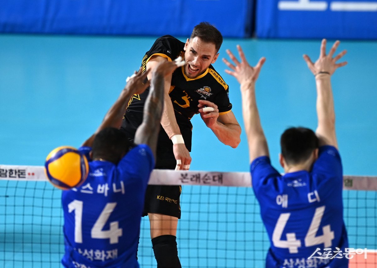 19일 대전충무체육관에서 열린 ‘도드람 2023~2024 V-리그’ 남자부 삼성화재와 KB손해보험 경기에서 KB손해보험 비예나가 삼성화재의 블로킹 사이로 스파이크를 날리고 있다.