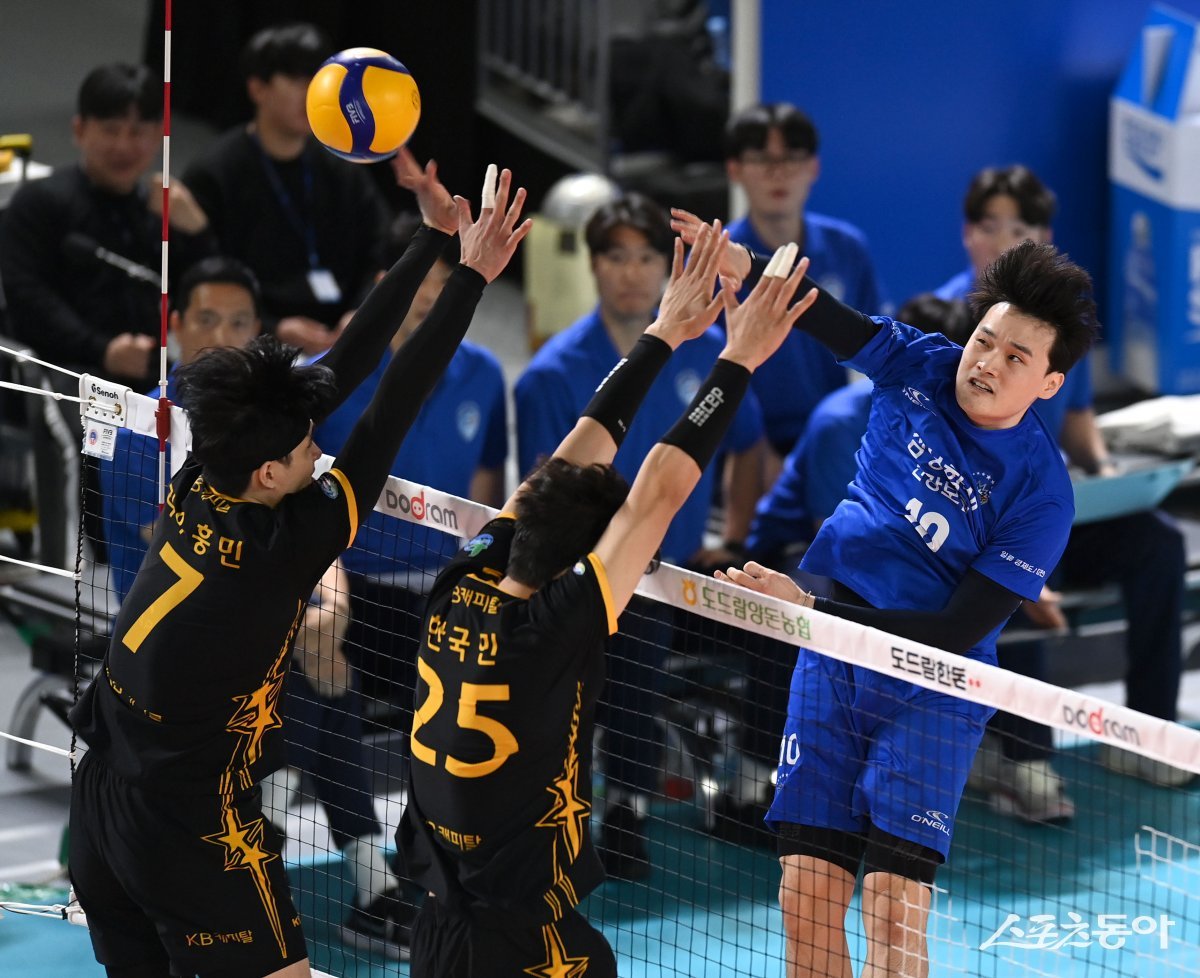 19일 대전충무체육관에서 열린 ‘도드람 2023~2024 V-리그’ 남자부 삼성화재와 KB손해보험 경기에서 삼성화재 김정호가 KB손해보험의 블로킹 사이로 스파이크를 날리고 있다.