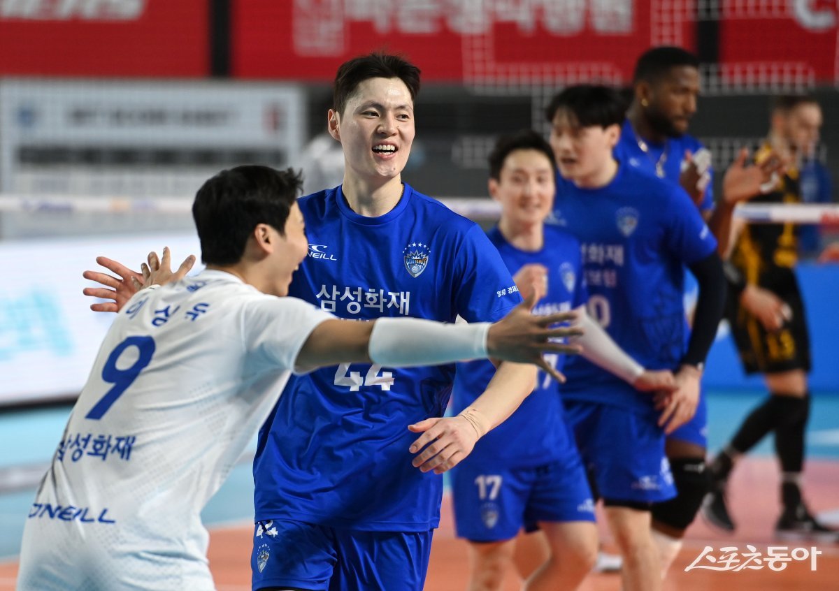 19일 대전충무체육관에서 열린 ‘도드람 2023~2024 V-리그’ 남자부 삼성화재와 KB손해보험 경기에서 삼성화재 에디가 공격 득점에 성공한 후 기뻐하고 있다.