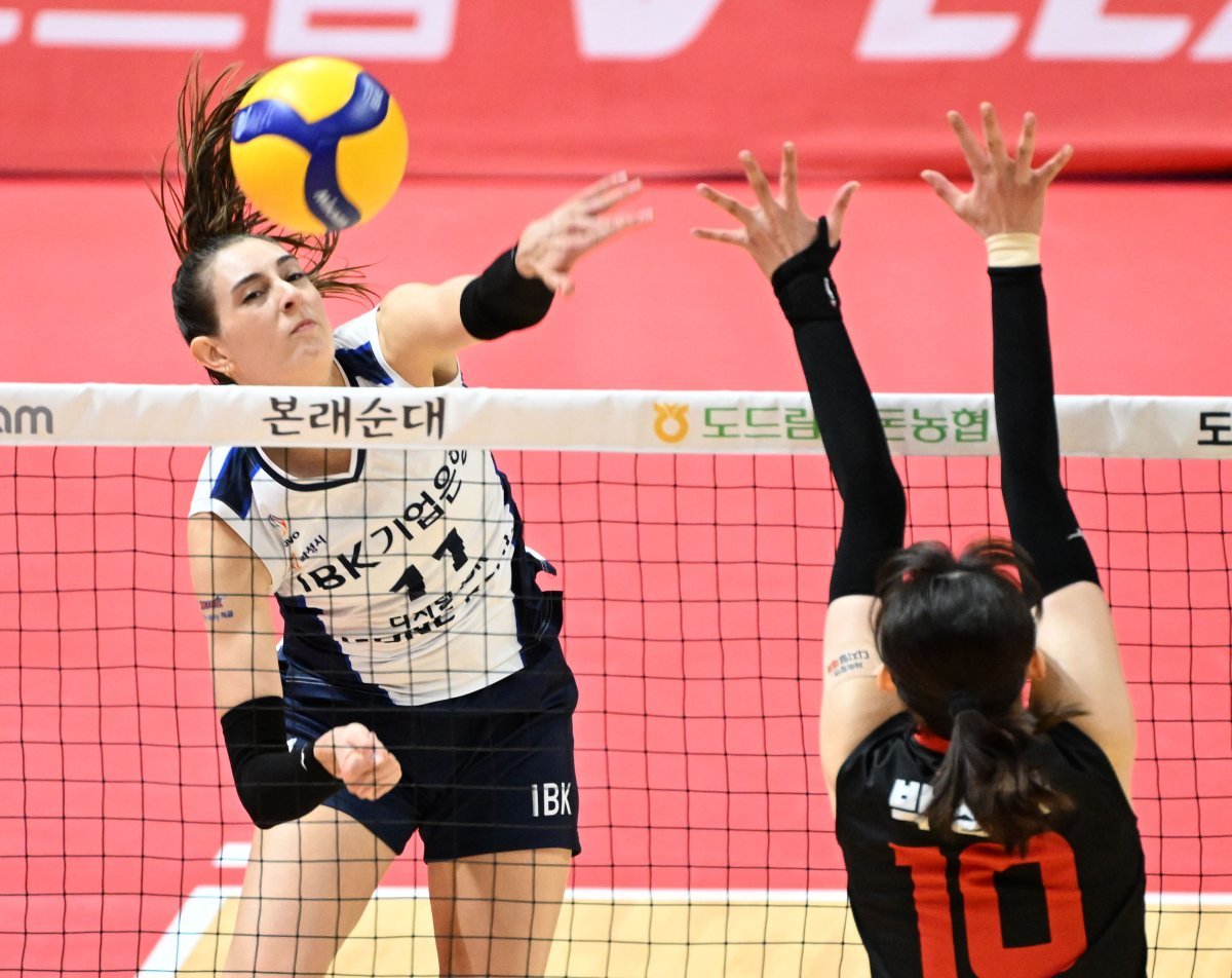 IBK기업은행은 19일 광주 페퍼스타디움에서 열린 ‘도드람 2023~2024 V리그’ 여자부 2라운드 원정경기에서 페퍼저축은행을 세트스코어 3-1(25-18 20-25 25-22 25-19)로 따돌렸다. IBK기업은행(4승6패·승점 11)은 한국도로공사(3승6패·승점 11)를 6위로 끌어내리고 5위로 한 계단 올라섰다. V리그에선 승점이 같으면 승수로 순위를 가린다. 페퍼저축은행(2승7패·승점 5)은 최하위를 벗어나지 못했다.