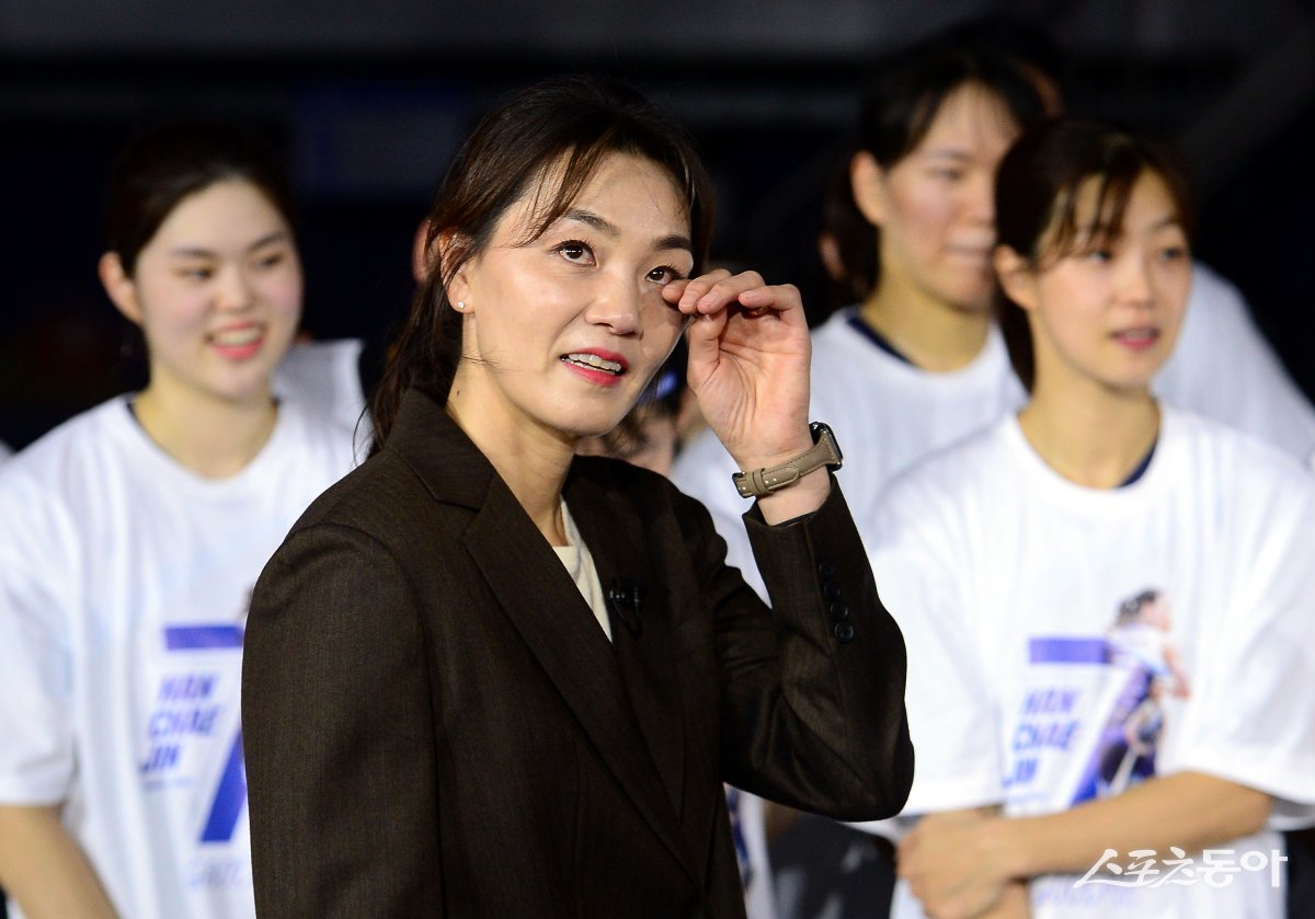 19일 인천 도원체육관에서 열린 ‘우리은행 우리 WON 2023-2024 여자프로농구’ 인천 신한은행과 부천 하나원큐의 경기에 앞서 한채진이 은퇴식을 갖고 눈물을 글썽이고 있다.