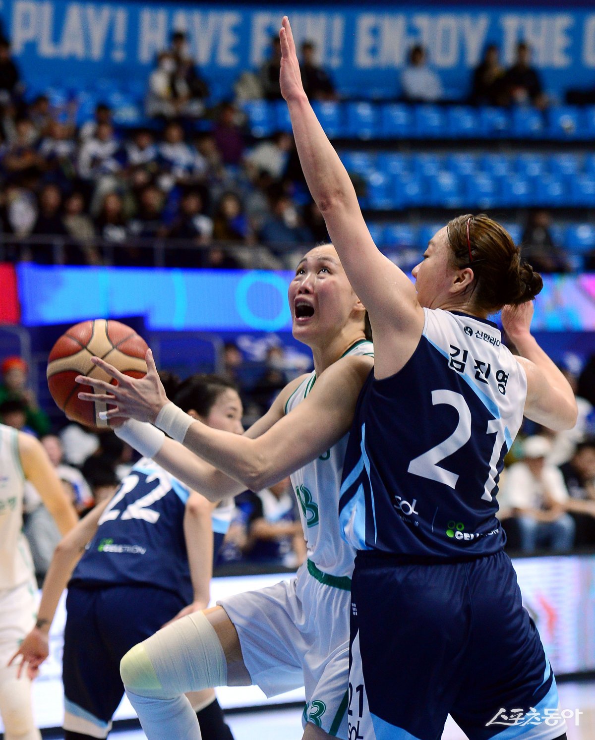 19일 인천 도원체육관에서 열린 ‘우리은행 우리 WON 2023-2024 여자프로농구’ 인천 신한은행과 부천 하나원큐의 경기에서 하나원큐 김정은이 신한은행 김진영의 수비를 피해 슛을 쏘고 있다.