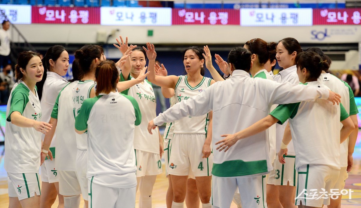 19일 인천 도원체육관에서 열린 ‘우리은행 우리 WON 2023-2024 여자프로농구’ 인천 신한은행과 부천 하나원큐의 경기에서 하나원큐가 신한은행을 상대로 79-65 승리한 후 선수들이 코트에서 기쁨을 나누고 있다.