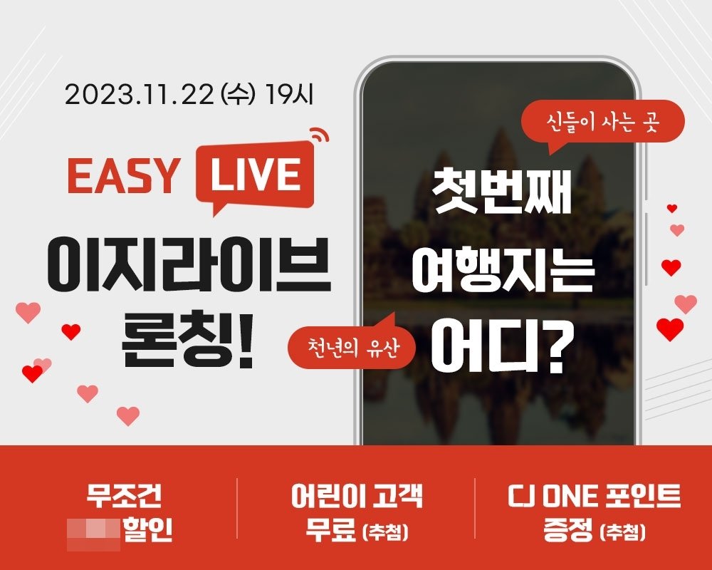 여행이지는 이날 방송에서 씨엠립 전세기 상품을 소개한다. 예약 방법과 캄보디아 여행 정보, CJ ONE 포인트 전환 및 사용 등과 관련된 콘텐츠를 선보일 계획이다. 시청자를 위한 다양한 혜택도 있다. 씨엠립 전세기 상품 할인과 함께 모든 시청자에게 추가 할인 혜택을 제공한다. 실시간 인증 이벤트로는 상품 예약내역을 인증한 시청자를 대상으로 추첨을 통해 2명에게 CJ ONE 포인트를 증정한다. 방송에서 소통에 적극 참여한 시청자 2명에게는 CJ ONE 일정 금액의 포인트를 제공한다.