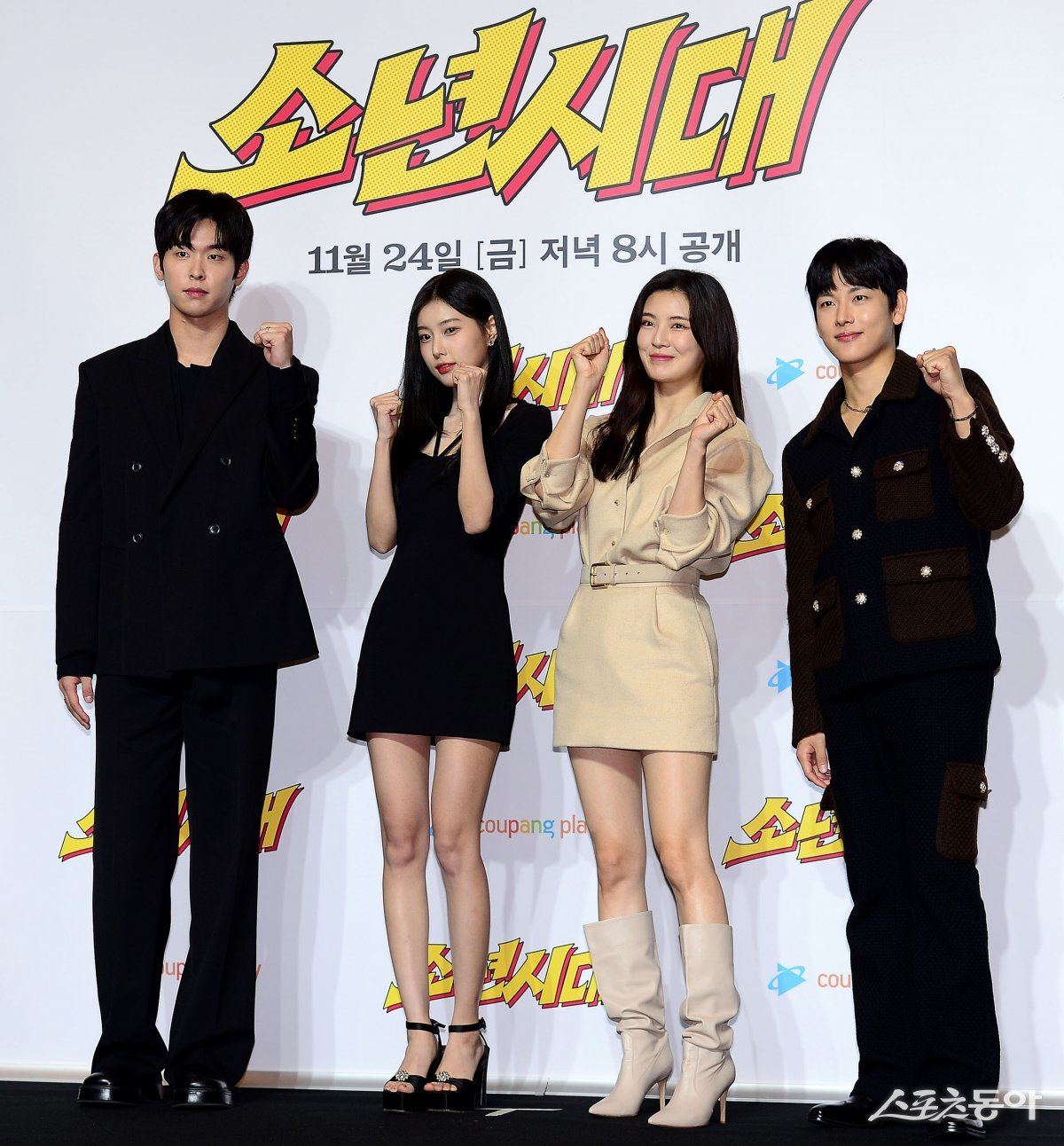 20일 서울 역삼동 조선 팰리스 강남 호텔에서 열린 쿠팡플레이 오리지널 드라마 ‘소년시대’ 제작발표회에 참석한 이시우(왼쪽부터), 강혜원, 이선빈, 임시완이 카메라를 향해 포즈를 취하고 있다.