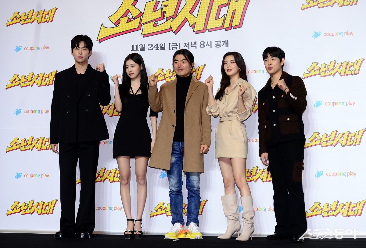 20일 서울 역삼동 조선 팰리스 강남 호텔에서 열린 쿠팡플레이 오리지널 드라마 ‘소년시대’ 제작발표회에 참석한 이시우(왼쪽부터), 강혜원, 이명우 감독, 이선빈, 임시완이 카메라를 향해 포즈를 취하고 있다.