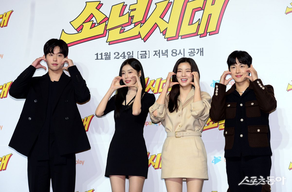 20일 서울 역삼동 조선 팰리스 강남 호텔에서 열린 쿠팡플레이 오리지널 드라마 ‘소년시대’ 제작발표회에 참석한 이시우(왼쪽부터), 강혜원, 이선빈, 임시완이 카메라를 향해 포즈를 취하고 있다.