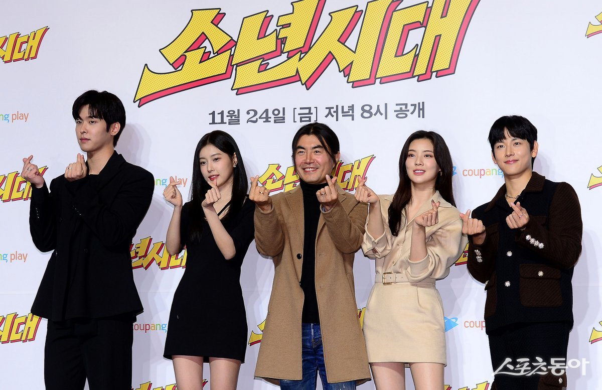 20일 서울 역삼동 조선 팰리스 강남 호텔에서 열린 쿠팡플레이 오리지널 드라마 ‘소년시대’ 제작발표회에 참석한 이시우(왼쪽부터), 강혜원, 이명우 감독, 이선빈, 임시완이 카메라를 향해 포즈를 취하고 있다.