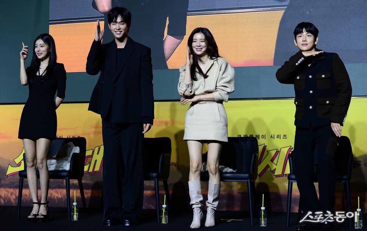 20일 서울 역삼동 조선 팰리스 강남 호텔에서 열린 쿠팡플레이 오리지널 드라마 ‘소년시대’ 제작발표회에 참석한 강혜원(왼쪽부터), 이시우, 이선빈, 임시우가 80년대 댄스를 선보이고 있다.