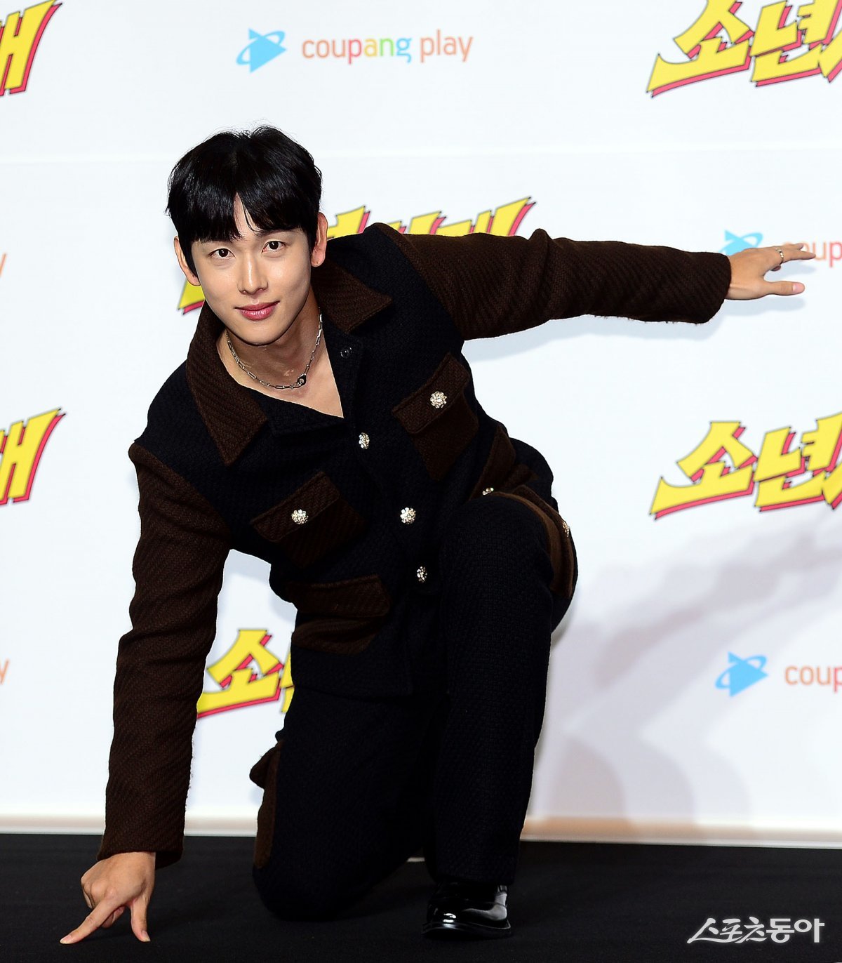 20일 서울 역삼동 조선 팰리스 강남 호텔에서 열린 쿠팡플레이 오리지널 드라마 ‘소년시대’ 제작발표회에 참석한 임시완이 카메라를 향해 포즈를 취하고 있다.
