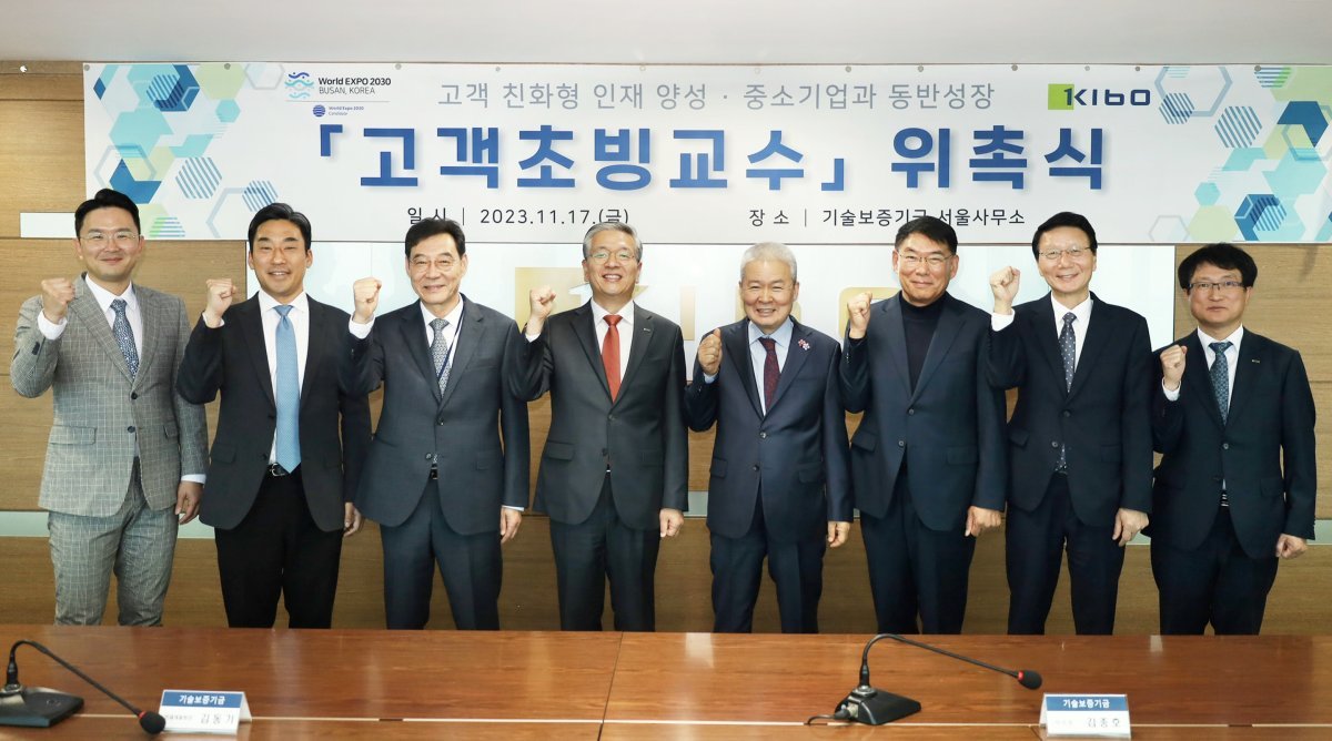 기술보증기금이 고객 친화형 인재 양성을 위해 ‘고객초빙교수 제도’를 도입한 가운데 김종호 이사장(왼쪽 네 번째)이 지난 17일 기보 서울사무소에서 진행된 위촉식에서 관계자들과 기념촬영을 하고 있다. 사진제공ㅣ기술보증기금