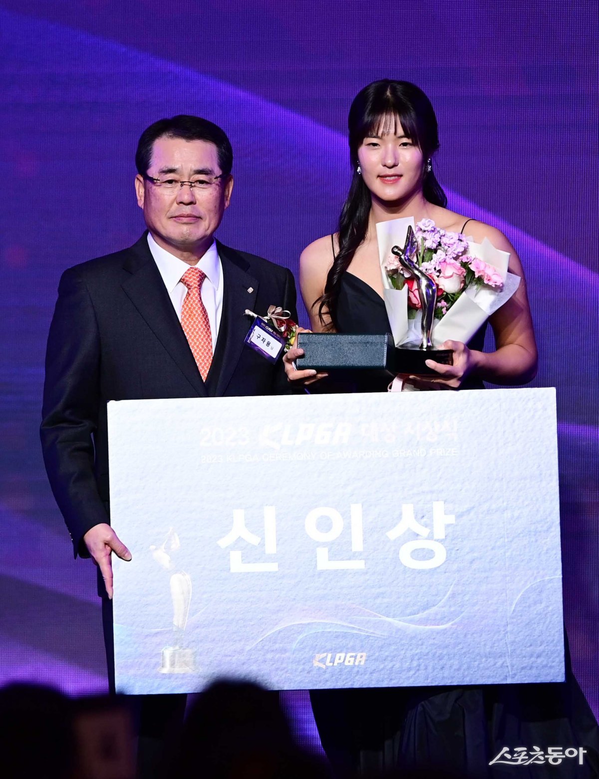 20일 서울 강남구 삼성동 그랜드인터컨티넨탈 서울파르나스에서 열린 ‘2023 KLPGA 대상 시상식’에서 신인상을 수상한 김민별이 기념 촬영을 하고 있다.