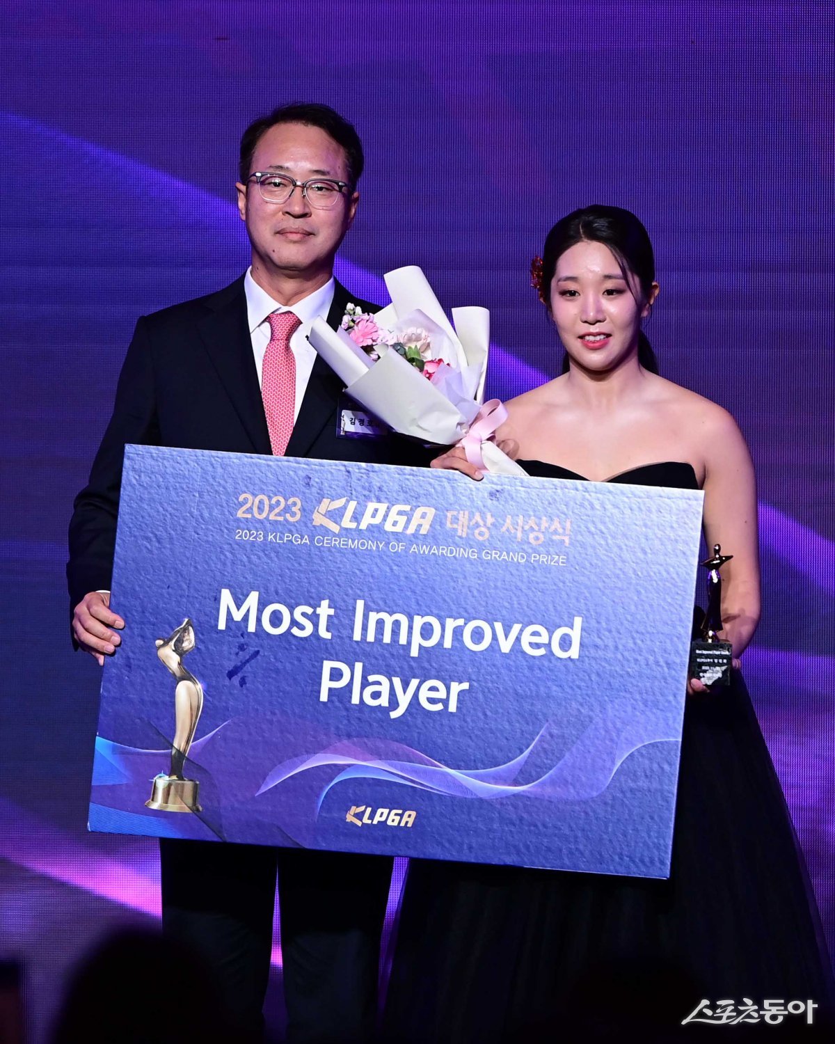 20일 서울 강남구 삼성동 그랜드인터컨티넨탈 서울파르나스에서 열린 ‘2023 KLPGA 대상 시상식’에서 Most Improved Player Award를 수상한 임진희가 기념 촬영을 하고 있다.