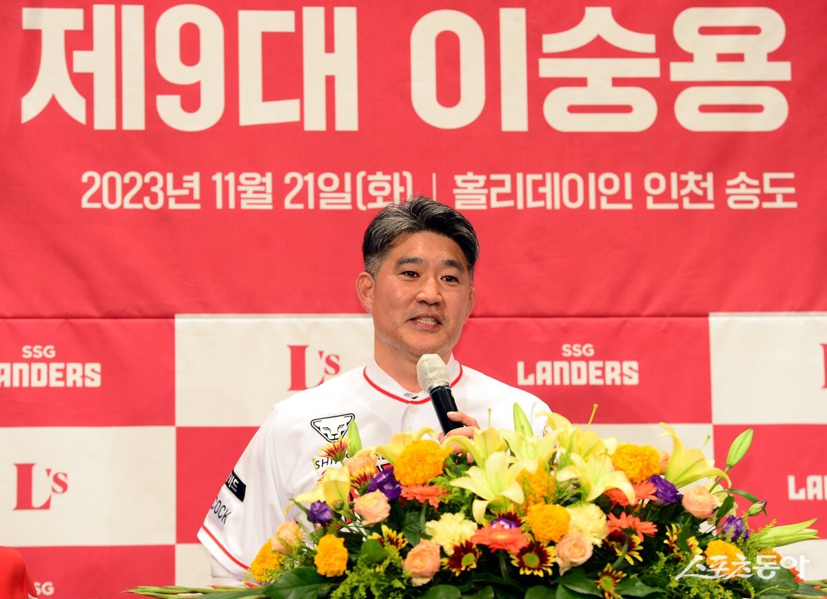 21일 인천 연수구 홀리데이인 인천 송도에서 SSG랜더스 제9대 이숭용 감독 취임식이 열렸다. SSG 이숭용 신임 감독이 취임 소감을 밝히고 있다.