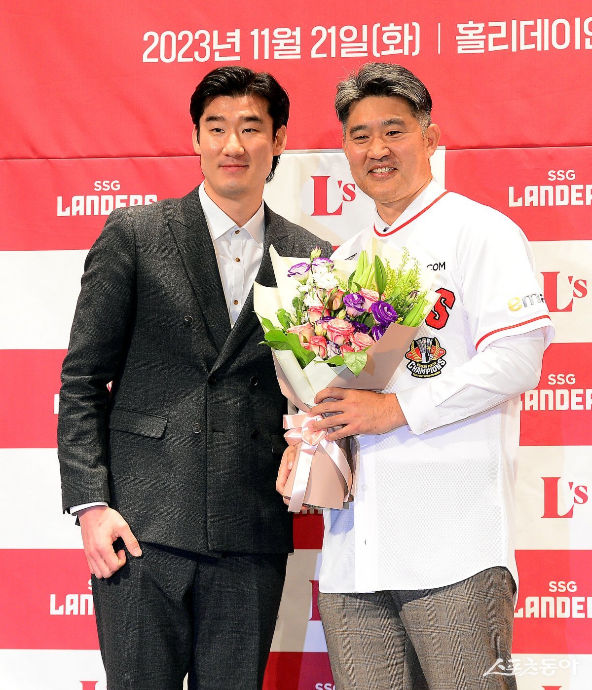 21일 인천 연수구 홀리데이인 인천 송도에서 SSG랜더스 제9대 이숭용 감독 취임식이 열렸다. SSG 이숭용 신임 감독이 주장 오태곤으로부터 꽃다발을 받은 후 기념촬영을 하고 있다.