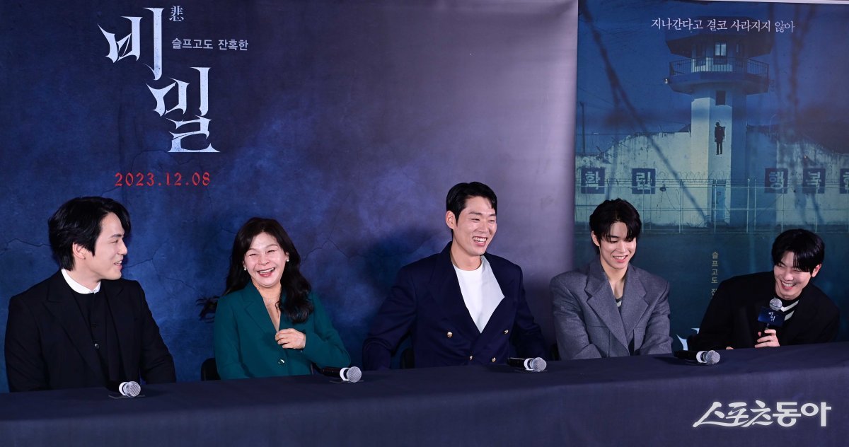배우 김정현, 길해연, 박성현, SF9 다원이 21일 서울 성동구 성수동 메가박스 성수에서 열린 영화 ’비밀‘ 언론시사회에서 최찬호의 답변에 웃고 있다.