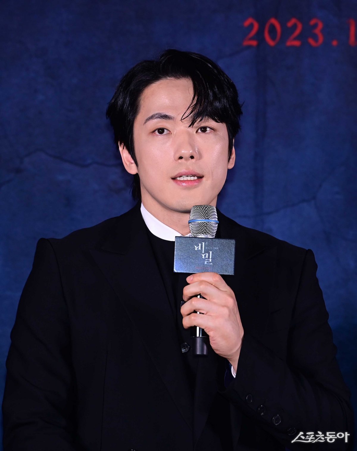 배우 김정현이 21일 서울 성동구 성수동 메가박스 성수에서 열린 영화 ’비밀‘ 언론시사회에서 인사말을 하고 있다.