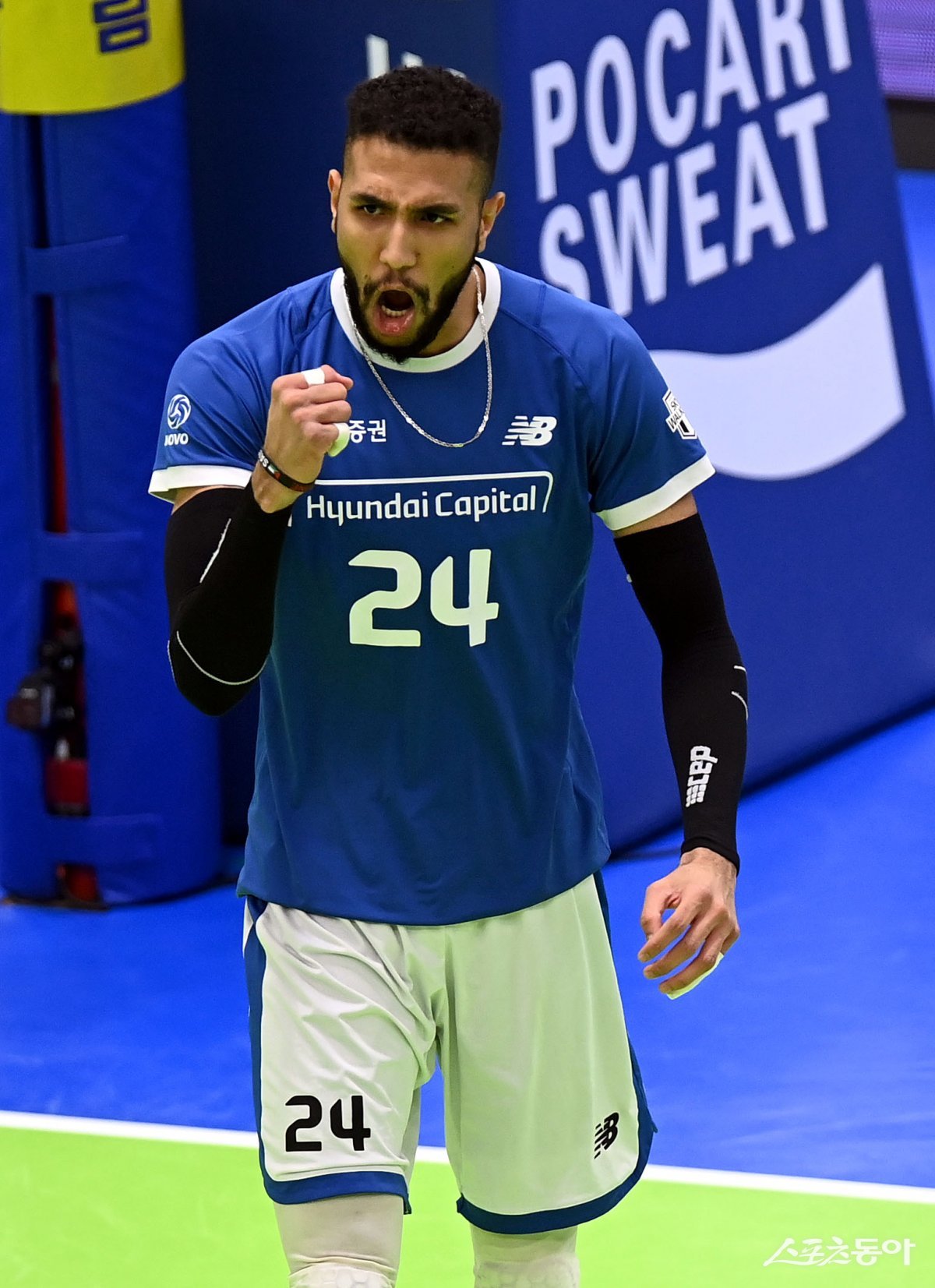 21일 경기도 수원체육관에서 ‘2023-2024 도드람 V리그’ 수원 한국전력과 천안 현대캐피탈의 남자부 경기가 열렸다. 현대캐피탈 아흐메드가 득점을 올린 후 환호하고 있다.