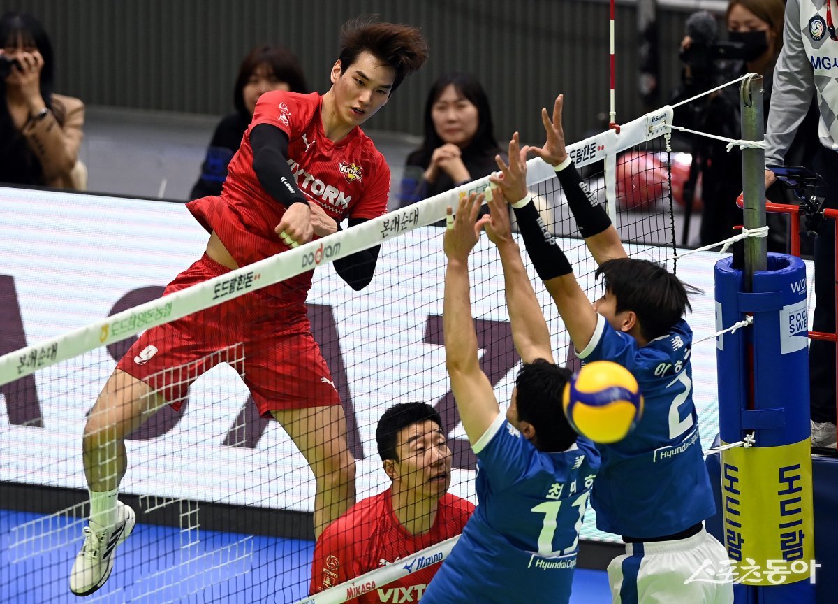 21일 경기도 수원체육관에서 ‘2023-2024 도드람 V리그’ 수원 한국전력과 천안 현대캐피탈의 남자부 경기가 열렸다. 한국전력 임성진이 현대캐피탈 블로커를 피해 스파이크를 날리고 있다.