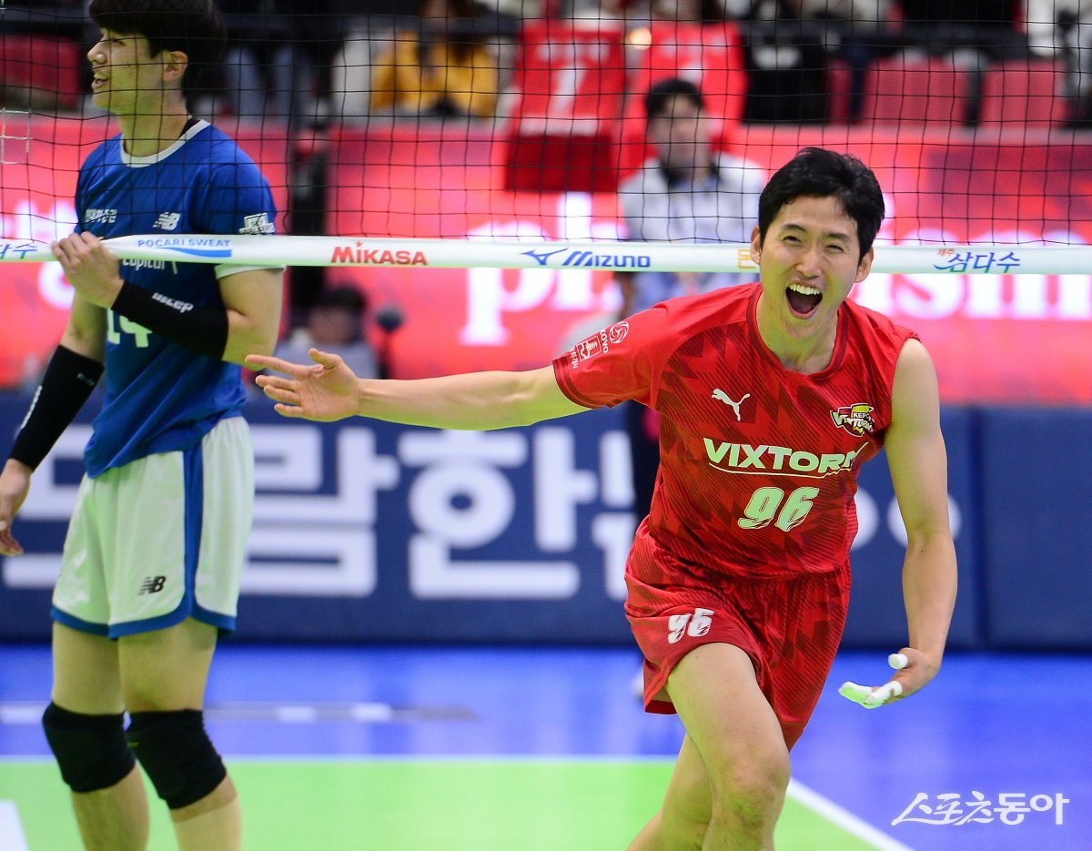 21일 경기도 수원체육관에서 ‘2023-2024 도드람 V리그’ 수원 한국전력과 천안 현대캐피탈의 남자부 경기가 열렸다. 한국전력 김동영이 득점을 올린 후 환호하고 있다.