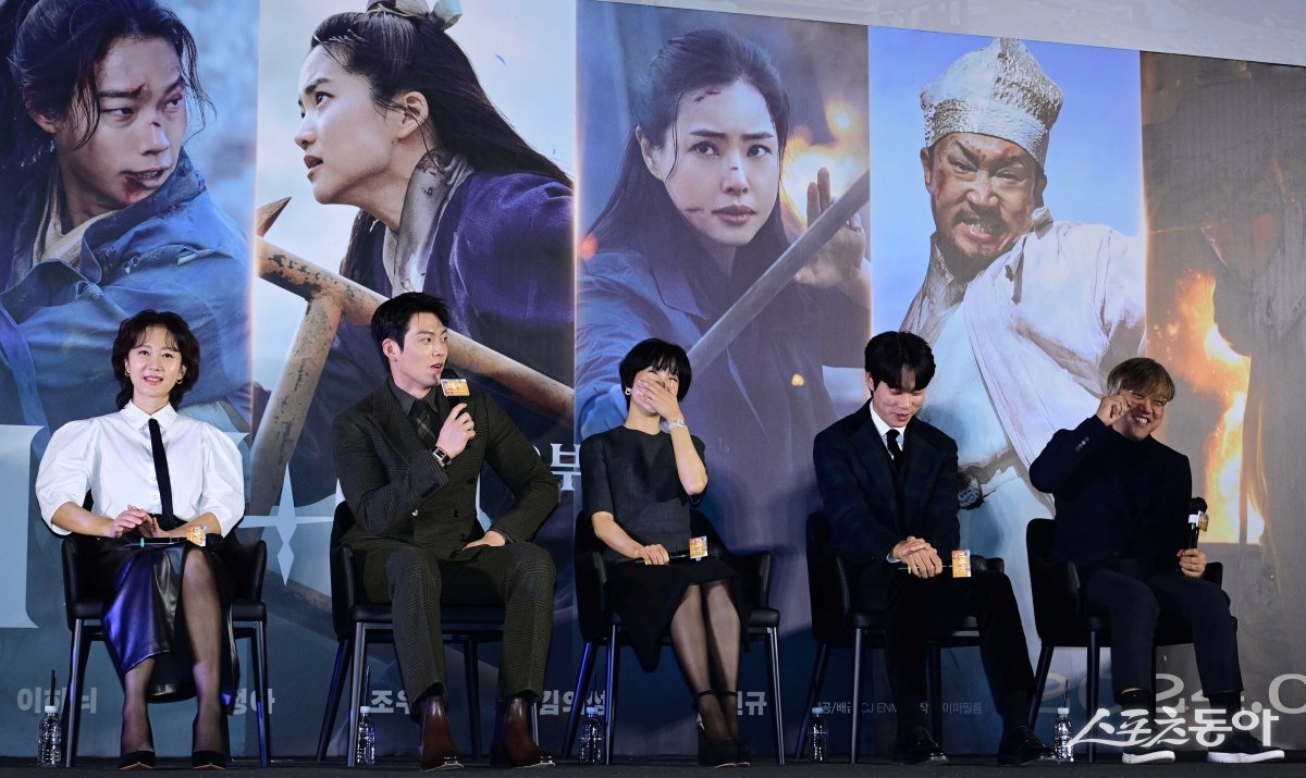 배우 염정아, 김태리, 류준열, 최동훈 감독이 22일 서울 용산구 CGV용산아이파크몰점에서 열린 영화 ‘외계+인’ 2부 제작보고회에서 김우빈의 답변에 웃고 있다.