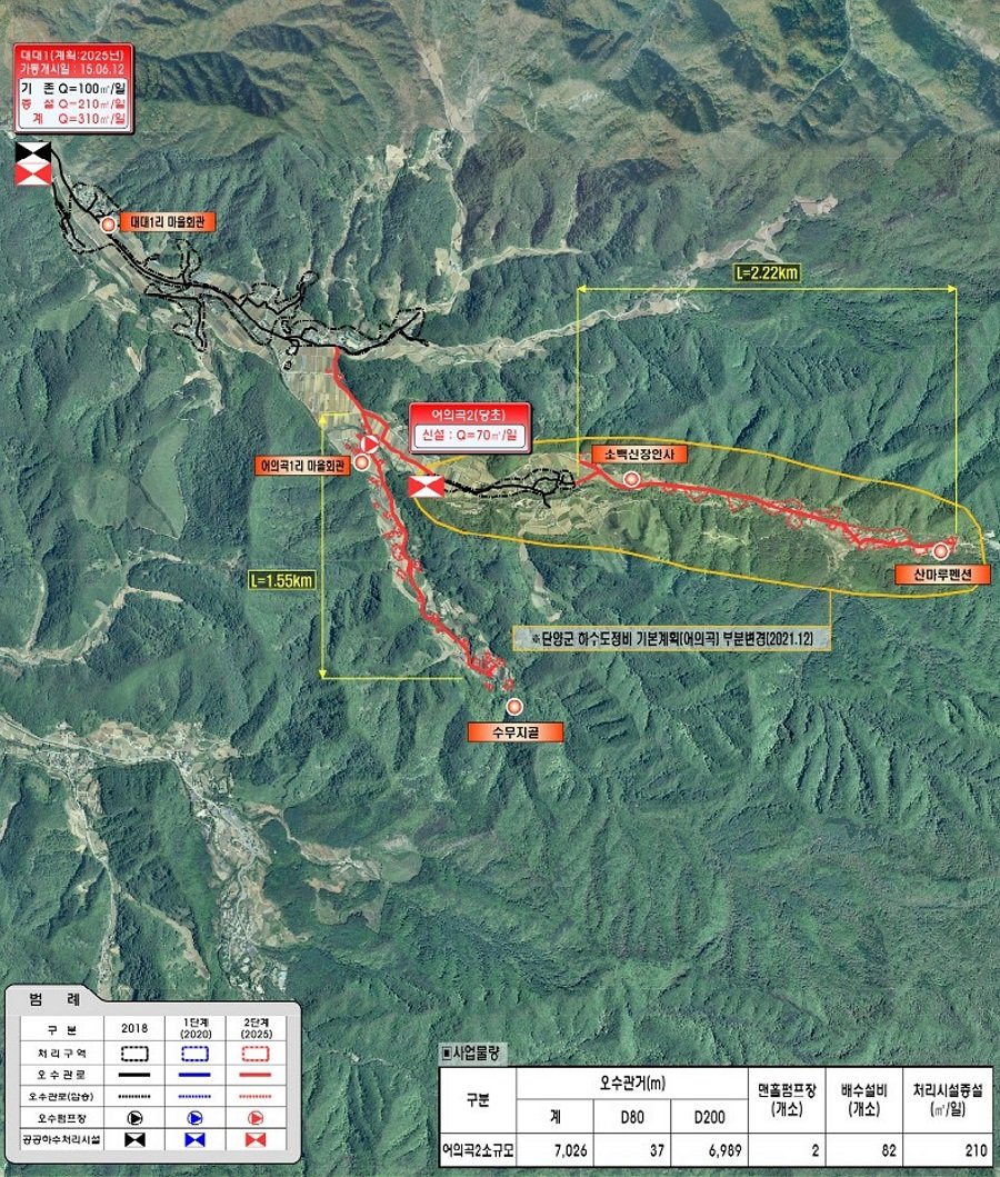 이와 별도로 구인사 하수처리시설을 공공시설로 전환하여 남천리 하수처리시설과 통합하는 사업에 179억원, 용부원1리·장림리를 북하리 하수처리시설과 통합하는 사업에 41억원 등 총사업비 220억원 규모의 사업을 하수도정비기본계획 반영하기 위해 추진하고 있다.