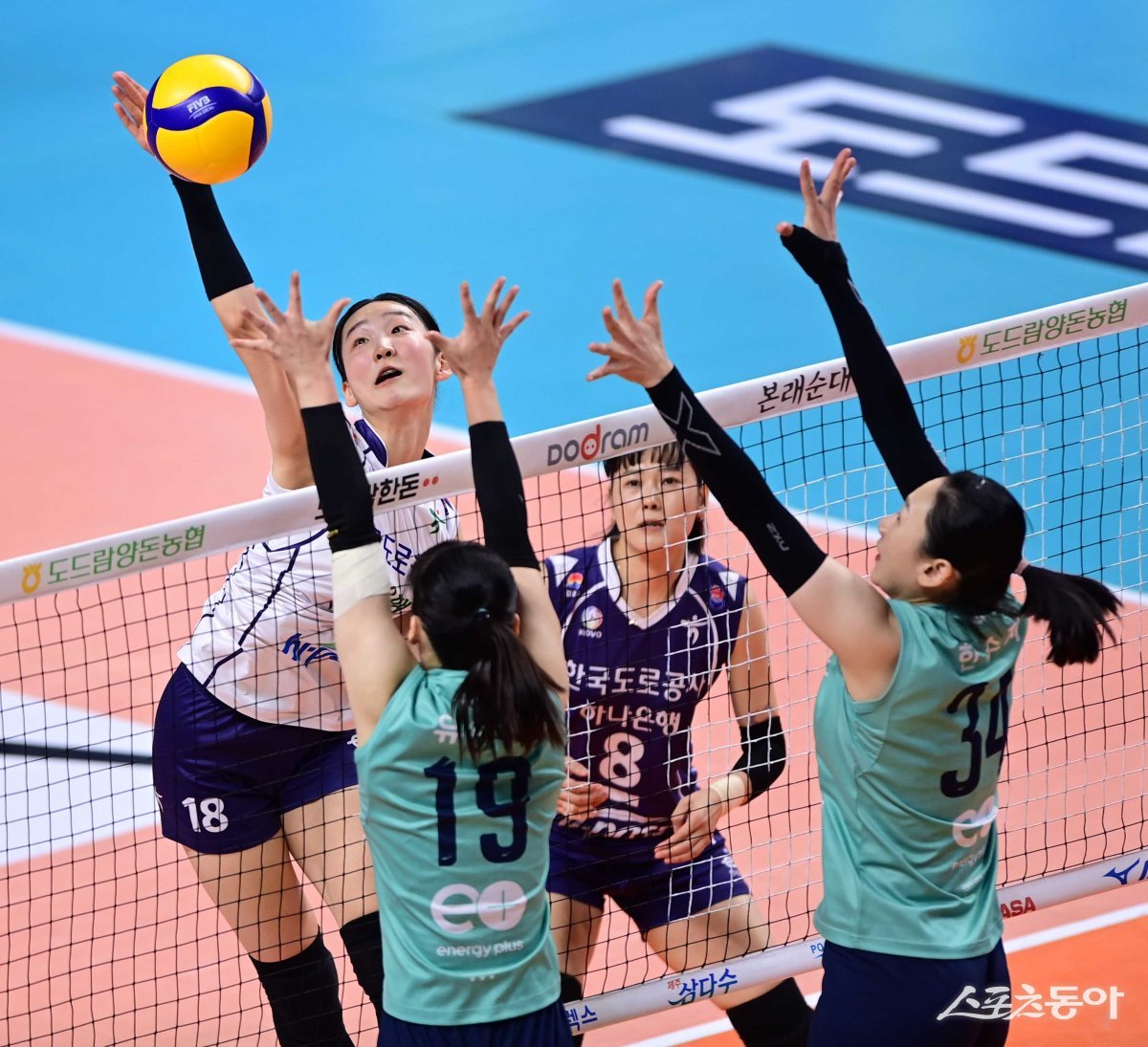 22일 서울 장충체육관에서 열린 ‘도드람 2023-2024 V리그’ 여자부 서울 GS칼텍스와 김천 한국도로공사의 경기에서 한국도로공사 김세빈이 GS칼텍스 블로커 앞에서 스파이크를 하고 있다.