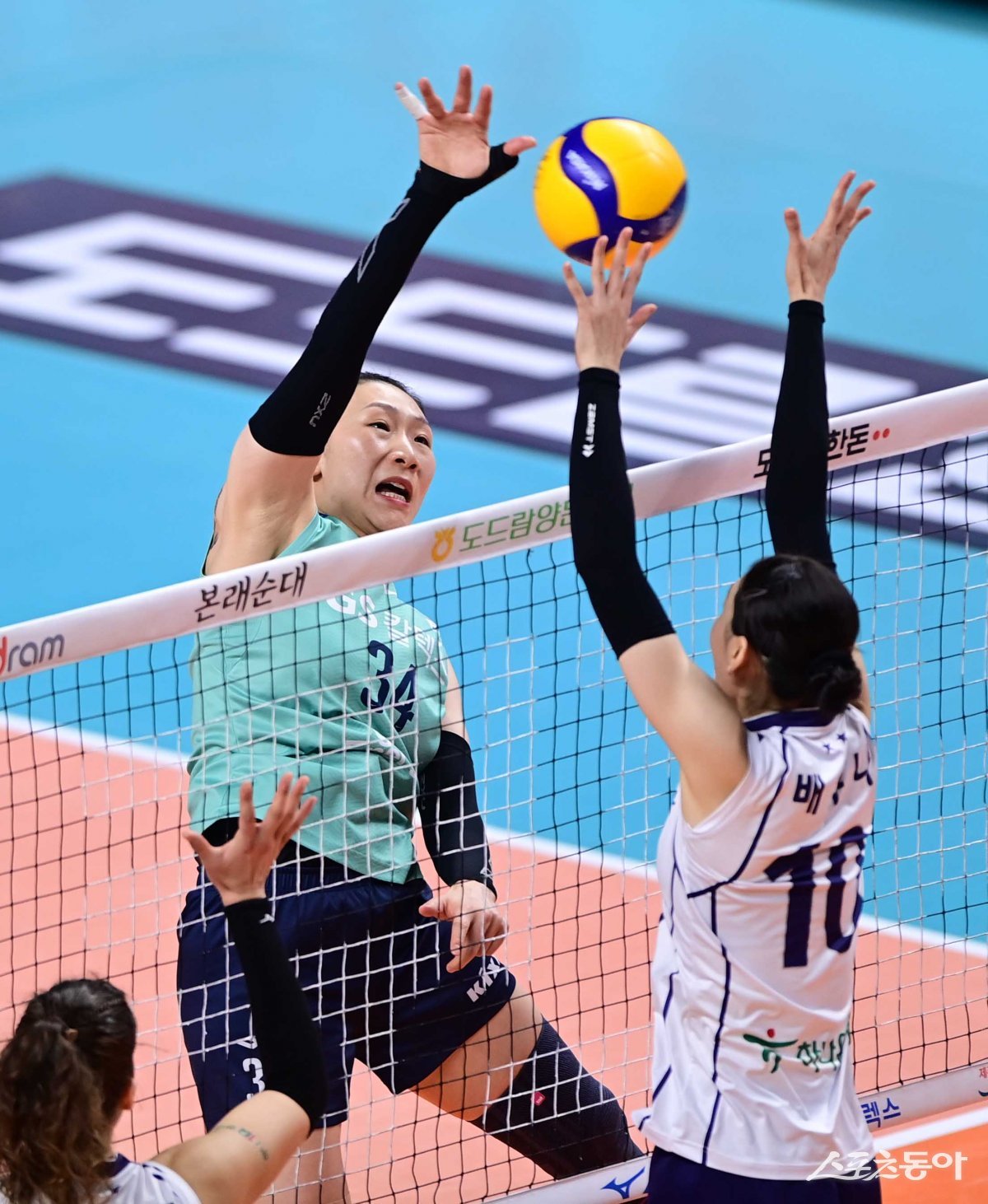 22일 서울 장충체육관에서 열린 ‘도드람 2023-2024 V리그’ 여자부 서울 GS칼텍스와 김천 한국도로공사의 경기에서 GS칼텍스 한수지가 한국도로공사 블로커 앞에서 스파이크를 하고 있다.