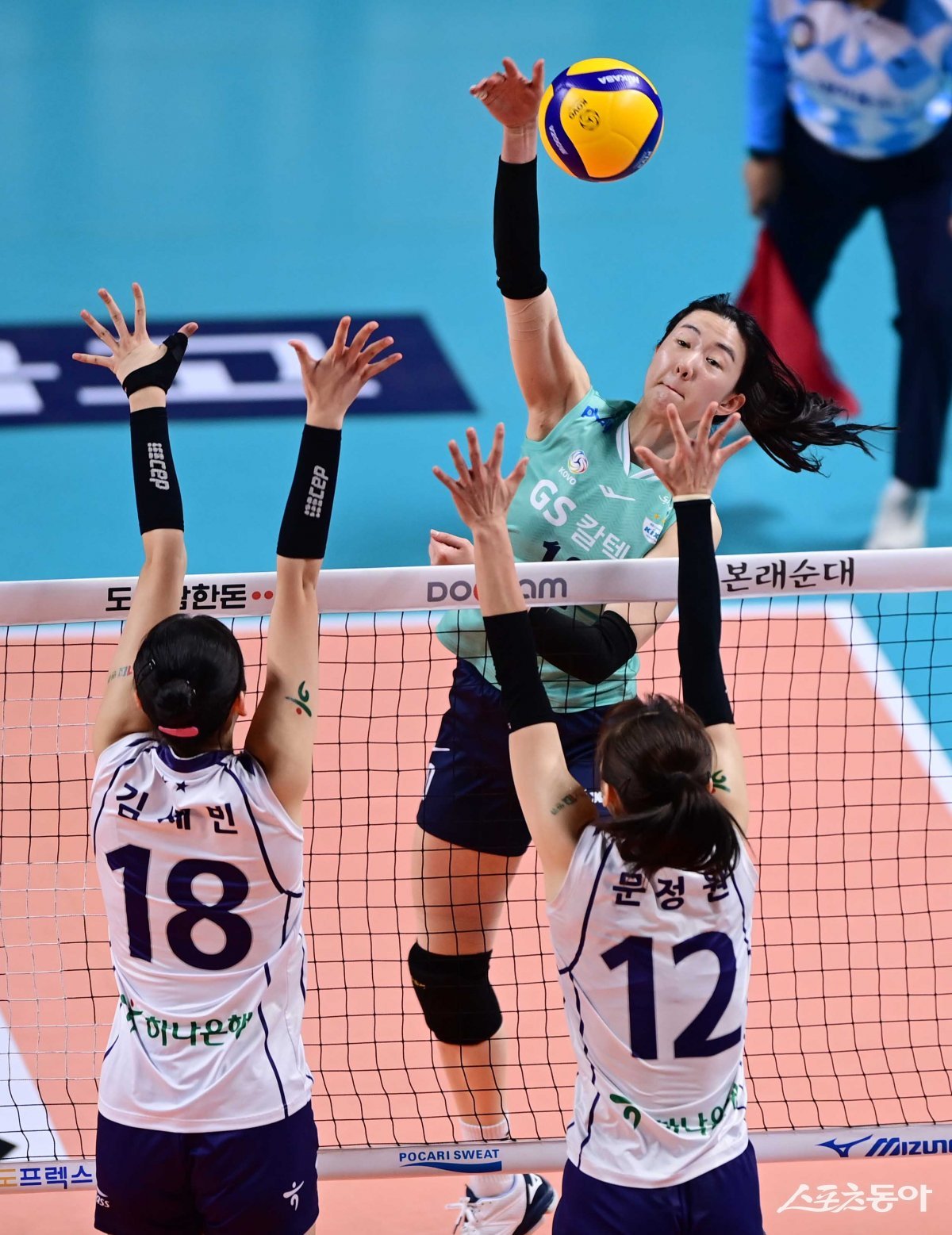 22일 서울 장충체육관에서 열린 ‘도드람 2023-2024 V리그’ 여자부 서울 GS칼텍스와 김천 한국도로공사의 경기에서 GS칼텍스 강소휘가 한국도로공사 블로커 앞에서 스파이크를 하고 있다.