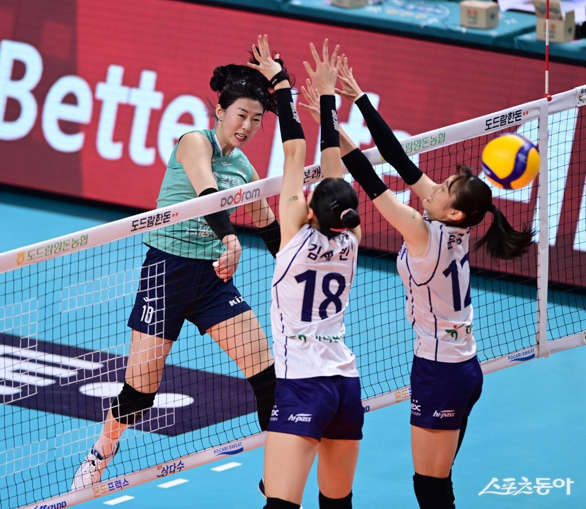 22일 서울 장충체육관에서 열린 ‘도드람 2023-2024 V리그’ 여자부 서울 GS칼텍스와 김천 한국도로공사의 경기에서 GS칼텍스 강소휘가 한국도로공사 블로커 앞에서 스파이크를 하고 있다.