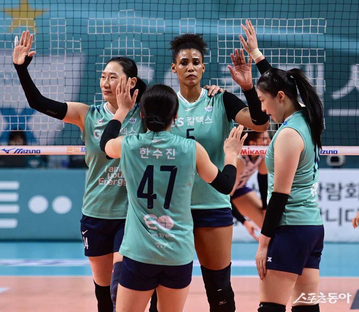 22일 서울 장충체육관에서 열린 ‘도드람 2023-2024 V리그’ 여자부 서울 GS칼텍스와 김천 한국도로공사의 경기에서 세트스코어 3-2로 승리한 GS칼텍스 선수들이 기쁨을 나누고 있다.